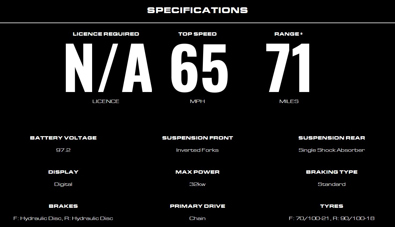 Packing a peak 32kW motor that delivers blistering acceleration and up to 754Nm of torque, it sprints from 0-60 mph in just 4.5 seconds. Its 97.2V 45Ah lithium-ion battery offers up to 70 miles of range, while advanced suspension, lightweight forged alloy frame, and off-road-ready 21inch/18inch wheels ensure exceptional control on any terrain.